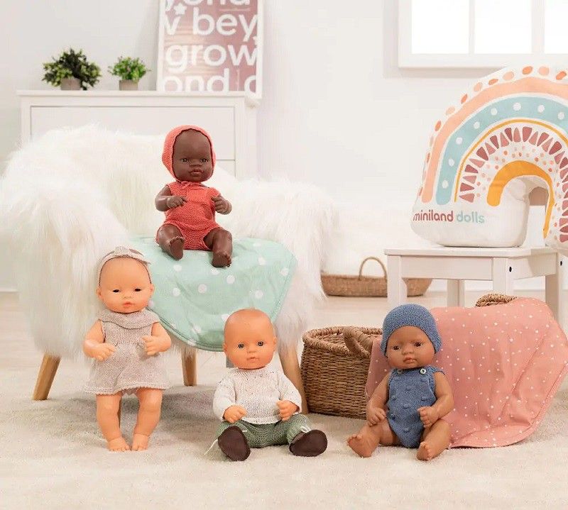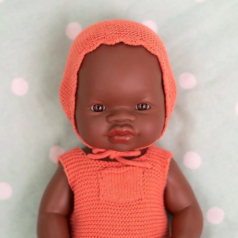 Capota y pichi de punto para muñecas y muñecos de 32cm. La nueva colección de ropita de punto para muñecos Miniland Dolls, está fabricada con materiales reciclados. Todos ellos en tonalidades naturales y con un aire “handmade”.