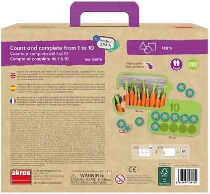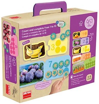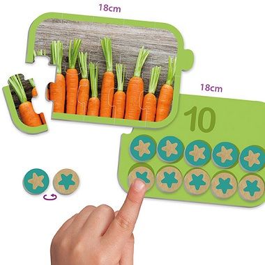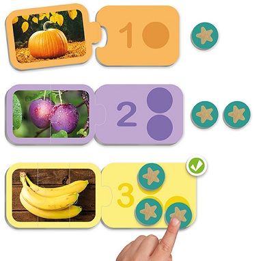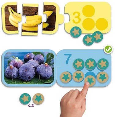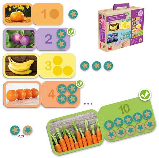 Juego manipulativo para aprender a contar del 1 al 10. Realiza los 10 puzles, cuenta los elementos de las imágenes y completa los tableros con las fichas circulares para alcanzar el número que se indica. Además, descubre la descomposición de los números de manera visual e intuitiva. ¡Aprende a contar con imágenes reales!