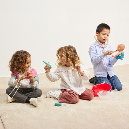 Los utensilios más comunes utilizados por médicos y enfermeros, llevados a un diseño simpático y de muy buen acabado. Funciona con pilas.