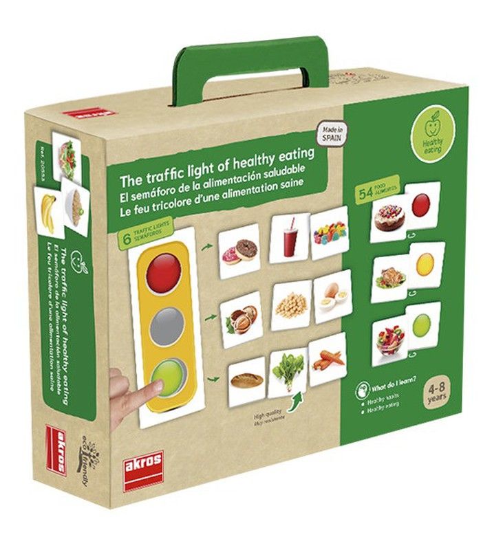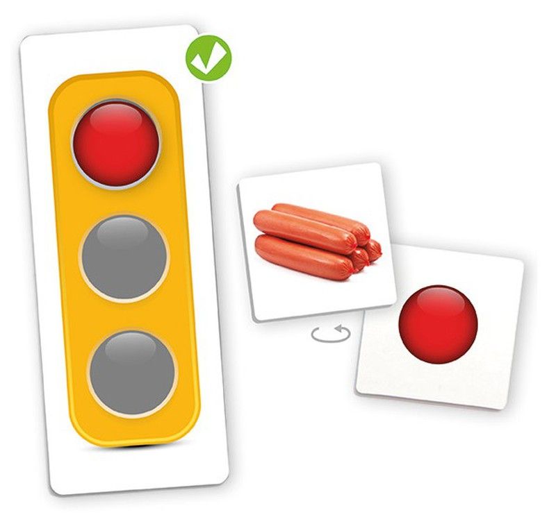 Juego de asociación para aprender a relacionar alimentos básicos con los colores del semáforo, en base a la frecuencia con que se deben tomar dichos alimentos, siendo el verde a menudo, el ámbar a veces y el rojo ocasionalmente.