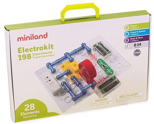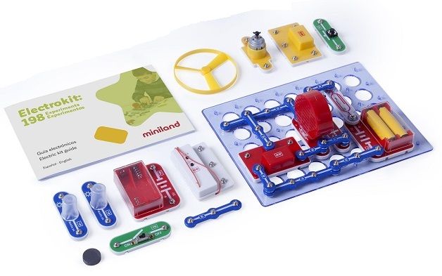 Primeros pasos en el mundo de la electrónica. Los portapilas, motores, altavoces, hélices, interruptores, portabombillas con bombillas, imanes, etc, se conectan sin herramientas para crear los 198 montajes que aparecen en el manual.