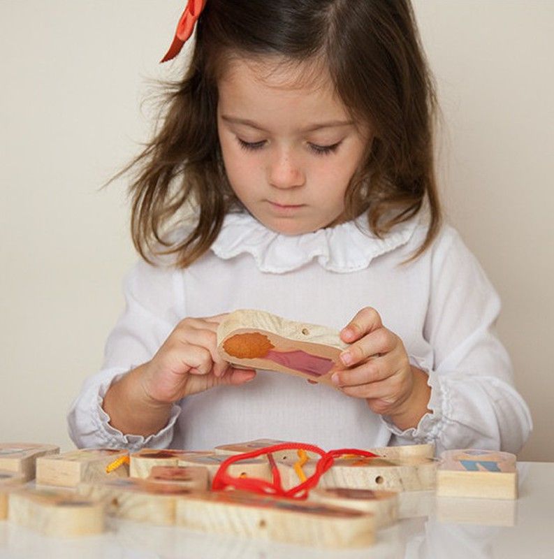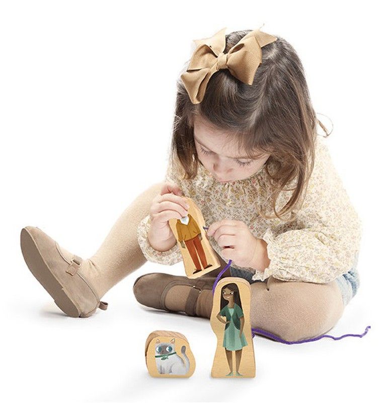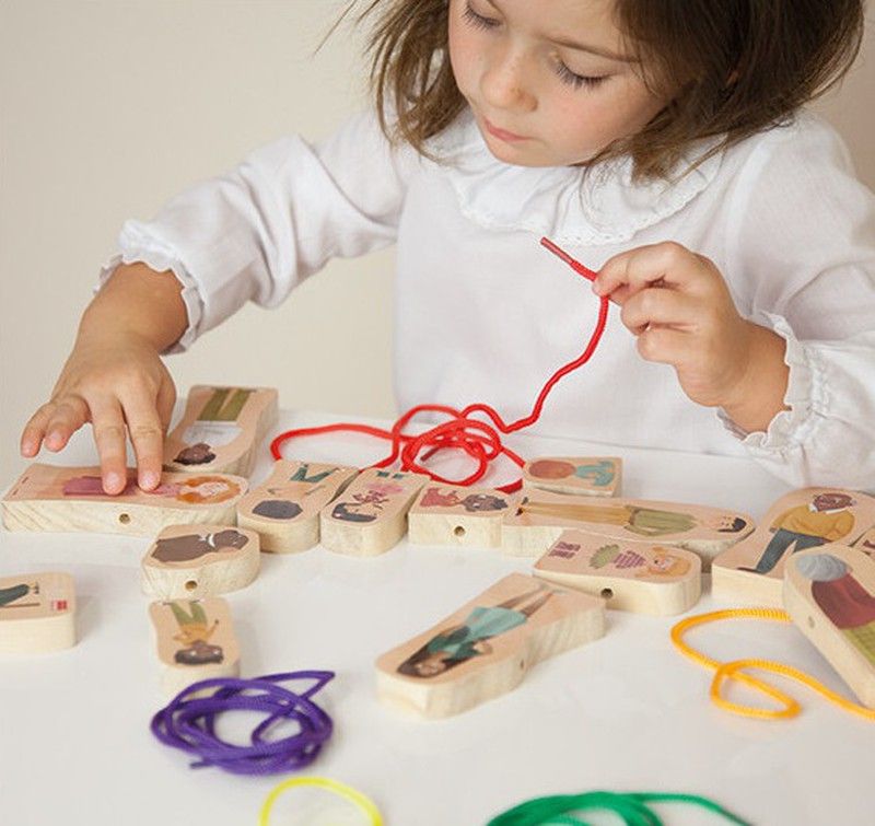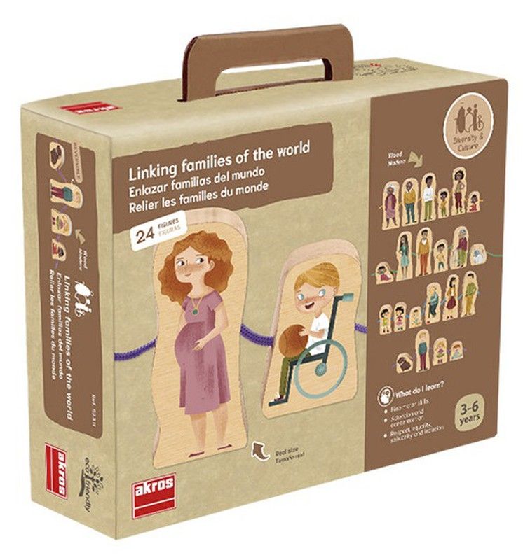 Set de 24 figuras de madera para enlazarlas entre sí, representando diversas familias del mundo. Permite al niño enlazar su propia familia y jugar con los personajes, que además se mantienen de pie. Desarrolla la psicomotricidad fina en niños a partir de 2 años. Inspirado en la metodología Montessori.