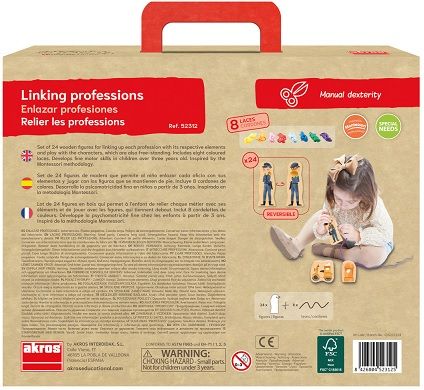 Set de 24 figuras de madera para enlazarlas entre sí, representando diferentes oficios y sus elementos relacionados. Permite al niño enlazar cada oficio con sus elementos y jugar con las figuras, que además se mantienen de pie. Desarrolla la psicomotricidad fina en niños a partir de 2 años. Inspirado en la metodología Montessori.