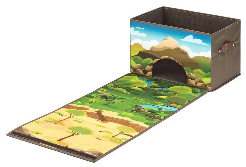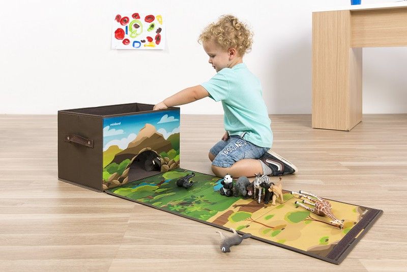 Baúl de tela de almacenaje con temática de naturaleza salvaje. Abierto, recrea un bosque o una selva donde los más pequeños podrán reconocer y recrear distintas situaciones con los animales salvajes de Miniland (de venta por separado). De material sintético, muy fácil de lavar, una vez plegado permite almacenar otros elementos y transportarlo fácilmente, ayudando a que los niños aprendan a recoger y desarrollen su sentido de la responsabilidad.