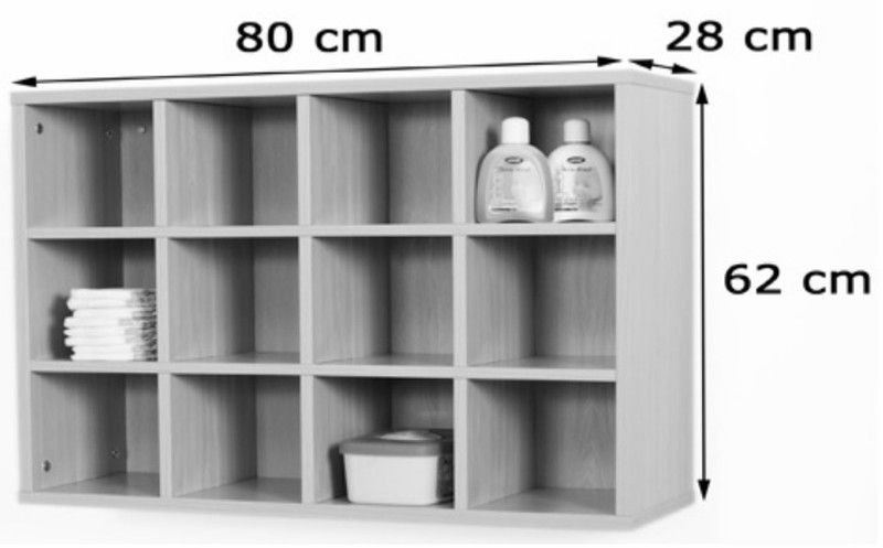 Mueble casillero con 12 casillas, fabricado en melamina de haya de 19 mm de grosor, trasera de 10 mm, separadores de casillas de 19 mm y cantos de PVC de 2 mm, acabado por las dos caras. Garantizado por los ensayos realizados en centro tecnológico de certificación de mobiliario TECNALIA..