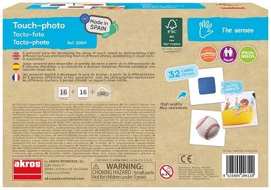 Juego sensorial para desarrollar el sentido del tacto, a partir de la diferenciación de hasta 8 texturas diferentes, y su asociación a diversas fotografías, estableciendo una relación visual-táctil.