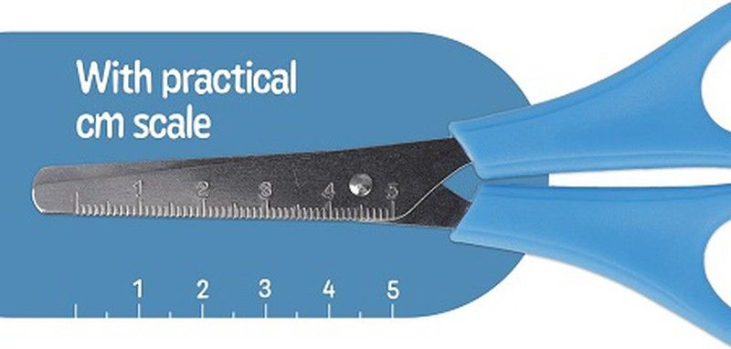 - Tijeras de puntas redondeadas. - Hojas de acero inoxidable con escala en centímetros. - Mango de plástico en varios colores. - Aptas para uso: Escolar, doméstico y de oficina. - Fabricadas también para zurdos. (Con mango bicolor: amarillo-naranja). - Garantía de 3 años. - Tamaño de 130 mm (5 pulgadas).