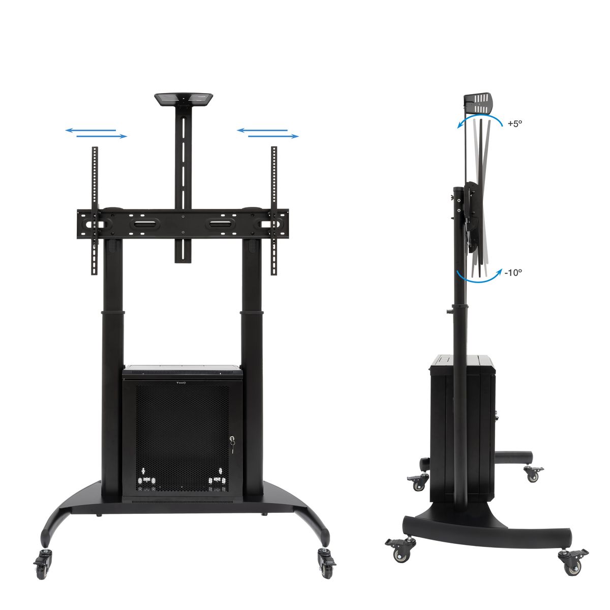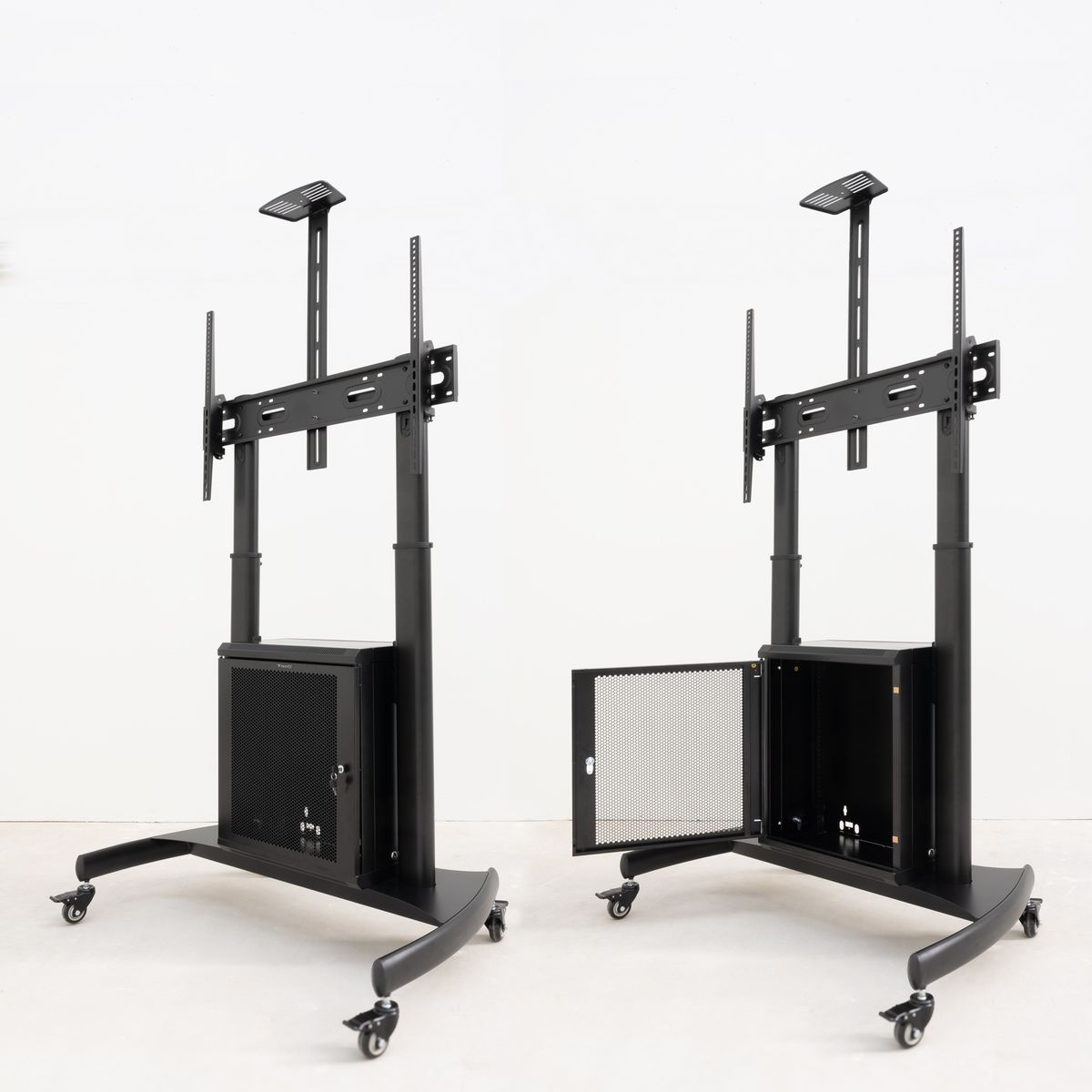Más informaciónCapacidad máxima de peso:100 kg|Tamaño mínimo de pantalla:152,4 cm (60")|Número de pantallas soportadas:1|Tamaño máximo de pantalla:2,54 m (100")|Compatibilidad con interfaz de montaje (min):400 x 400 mm|Compatibilidad con interfaz de montaje (max):1000 x 600 mm|Tipo de montaje:Piso|Ajustes de altura:Si|Rango de ajustes de altura:1365 - 1685 mm|Ajuste de la inclinación:Si|Ángulo de inclinación:-10 - 5°|Ruedas:Si|Número de ruedas:4 rueda(s)|Ruedas que se pueden bloquear:Si|Gestión de cables:Si|Color del producto:Negro|Material de la carcasa:Acero|Manual de usuario:Si|Kit de montaje:Si|Contenido del paquete:1 x Soporte; 1 x Bandeja; 1 x Armario; 1 x Accesorios Rack|Peso:27 kg|Peso del paquete:29,5 kg|Dimensiones de la caja 1 (Ancho x Profundidad x Altura):1305 x 805 x 177 mm|Dimensiones de la caja 2 (Ancho x Profundidad x Altura):666 x 66 x 180 mm