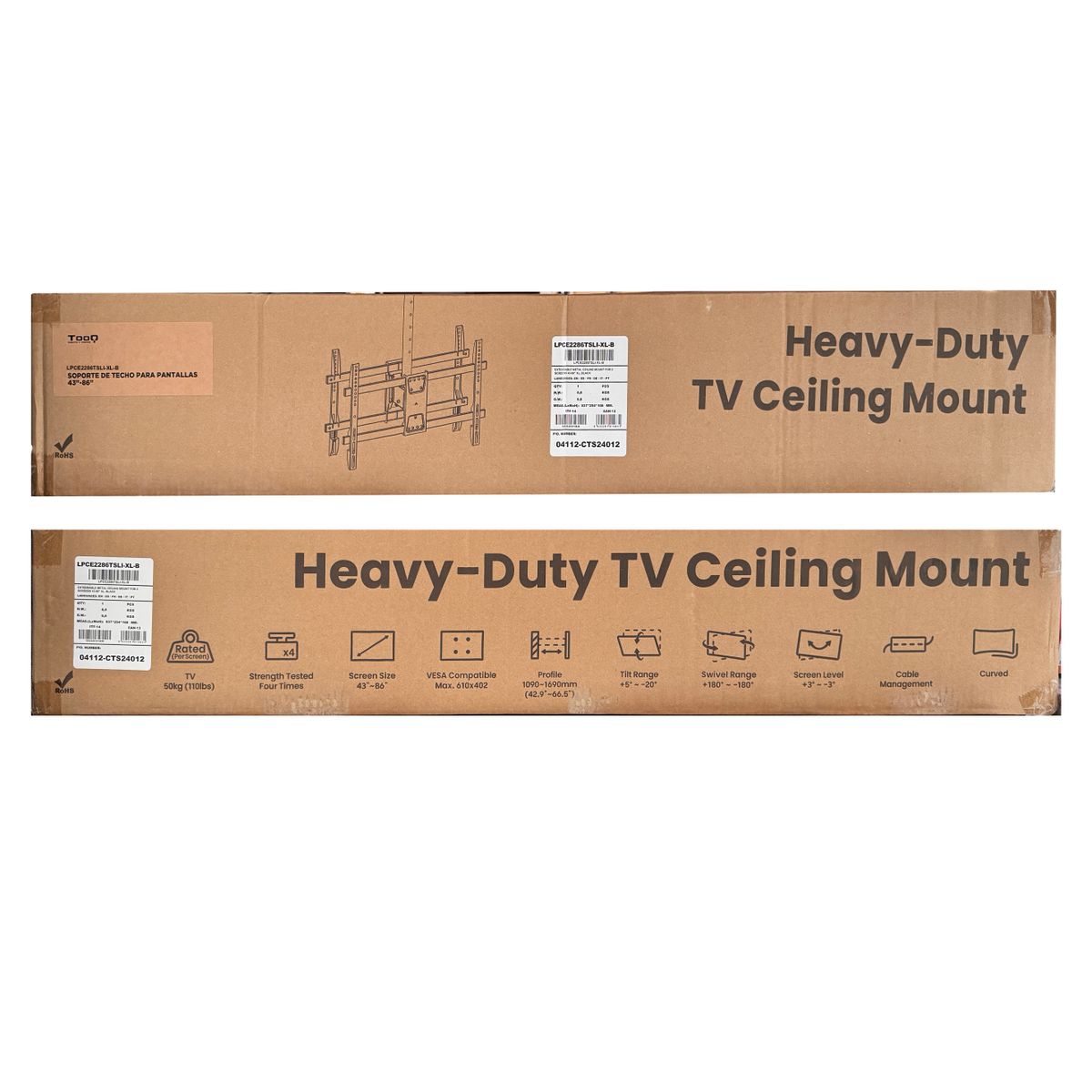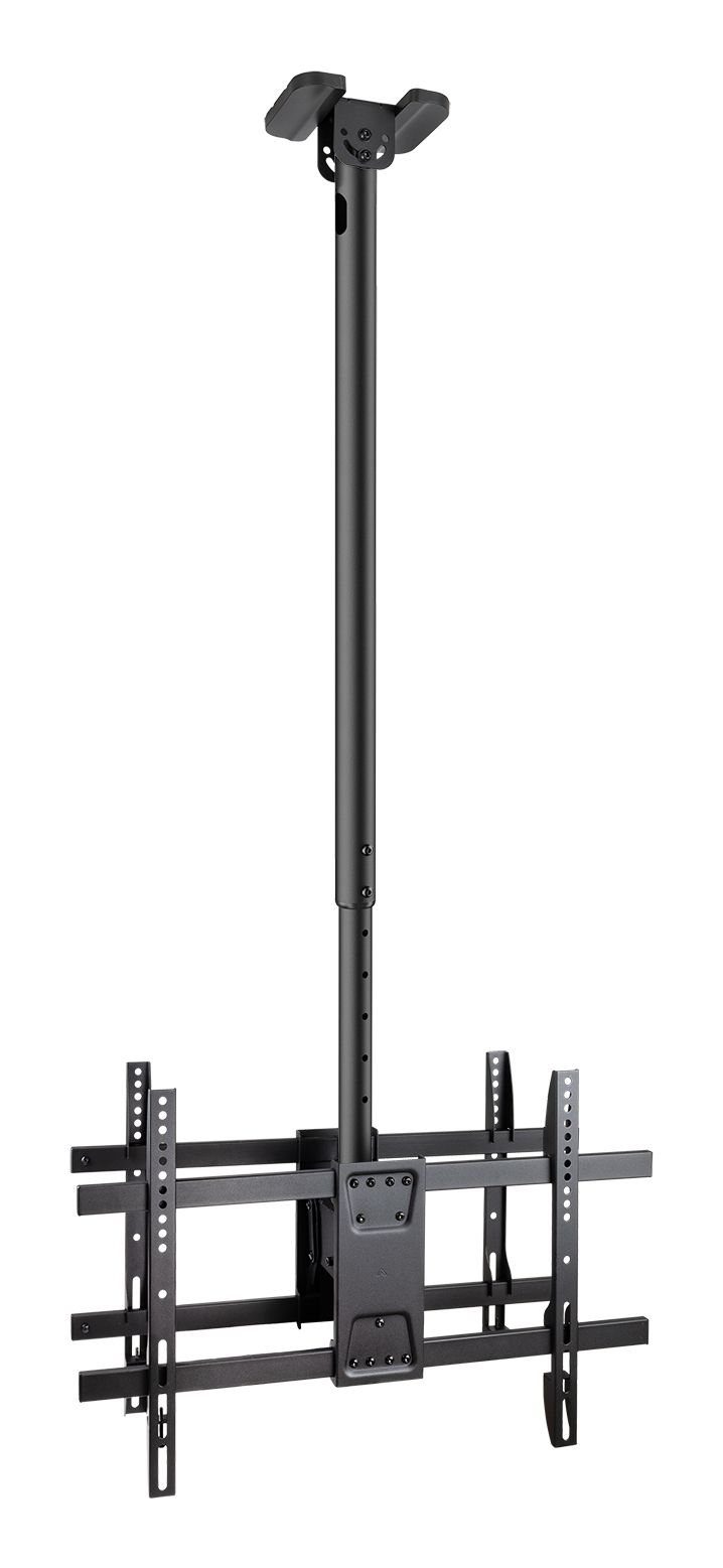 Más informaciónCapacidad máxima de peso:100 kg|Tamaño mínimo de pantalla:109,2 cm (43")|Número de pantallas soportadas:2|Tamaño máximo de pantalla:2,18 m (86")|Compatibilidad con interfaz de montaje (min):200 x 200 mm|Compatibilidad con interfaz de montaje (max):600 x 400 mm|Interfaz de panel de montaje:200 x 200,300 x 300,400 x 200,400 x 400,600 x 400|Tipo de montaje:Techo|Ajustes de altura:Si|Tipo de ajuste de altura:Manual|Rango de ajustes de altura:1090 - 1690 mm|Ajuste de la inclinación:Si|Ángulo de inclinación:-20 - 5°|Giratorio:Si|Ángulo de giro (alcance):-180 - 180°|Ángulo de pivote:-60 - 60°|Gestión de cables:Si|Indicado para pantalla curvada:Si|Color del producto:Negro|Material de la carcasa:Acero|Cantidad por paquete:1 pieza(s)|Manual de usuario:Si|Kit de montaje:Si|Contenido del paquete:1 x Soporte1 x Kit montaje (incluye herramientas)1 x Manual de instalación|Ancho:689 mm|Altura:1905 mm|Peso:8,8 kg|Ancho del paquete:937 mm|Profundidad del paquete:168 mm|Altura del paquete:254 mm|Peso del paquete:9,5 kg|Tipo de embalaje:Caja