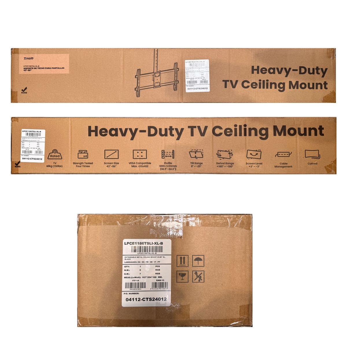 Más informaciónCapacidad máxima de peso:60 kg|Tamaño mínimo de pantalla:109,2 cm (43")|Número de pantallas soportadas:1|Tamaño máximo de pantalla:2,18 m (86")|Compatibilidad con interfaz de montaje (min):200 x 200 mm|Compatibilidad con interfaz de montaje (max):600 x 400 mm|Interfaz de panel de montaje:200 x 200,300 x 300,400 x 200,400 x 400,600 x 400|Tipo de montaje:Techo|Ajustes de altura:Si|Tipo de ajuste de altura:Manual|Rango de ajustes de altura:1090 - 1690 mm|Ajuste de la inclinación:Si|Ángulo de inclinación:-25 - 0°|Giratorio:Si|Ángulo de giro (alcance):-180 - 180°|Ángulo de pivote:-60 - 60°|Gestión de cables:Si|Indicado para pantalla curvada:Si|Color del producto:Negro|Material de la carcasa:Acero|Cantidad por paquete:1 pieza(s)|Manual de usuario:Si|Kit de montaje:Si|Contenido del paquete:1 x Soporte1 x Kit montaje (incluye herramientas)1 x Manual de instalación|Ancho:689 mm|Altura:1905 mm|Peso:5,95 kg|Ancho del paquete:937 mm|Profundidad del paquete:168 mm|Altura del paquete:254 mm|Peso del paquete:6,9 kg|Tipo de embalaje:Caja
