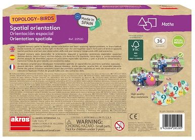 Original memory para desarrollar la orientación espacial y aprender posiciones espaciales opuestas: delante-detrás, dentro-fuera, encima-debajo, a la derecha-a la izquierda, cerca-lejos, y juntos-separados. ¡Forma parejas de divertidos pájaros en posiciones espaciales opuestas, y pon a prueba tu observación y memoria! Fichas de gran tamaño con escenarios reales.